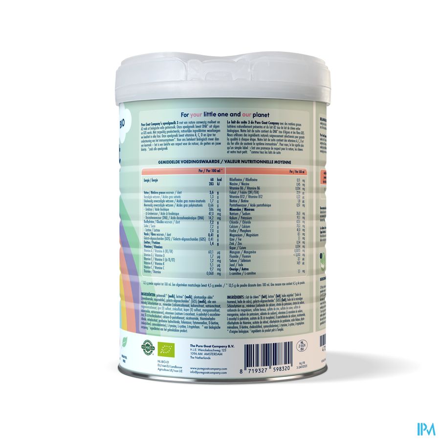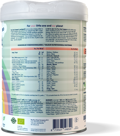 Pure Goat Lait de Suite 3 est fabriqué à partir de lait de chèvre biologique et d'autres ingrédients biologiques. Il constitue une excellente alternative aux préparations à base de lait de vache.